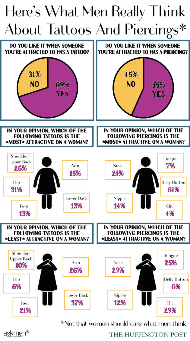Of the men surveyed, only 32 percent had tattoos of their own and only 13 percent had body piercings, however in both categories, over 50 percent responded that they are attracted to piercings and tattoos on women. In general, men found hip tattoos to …